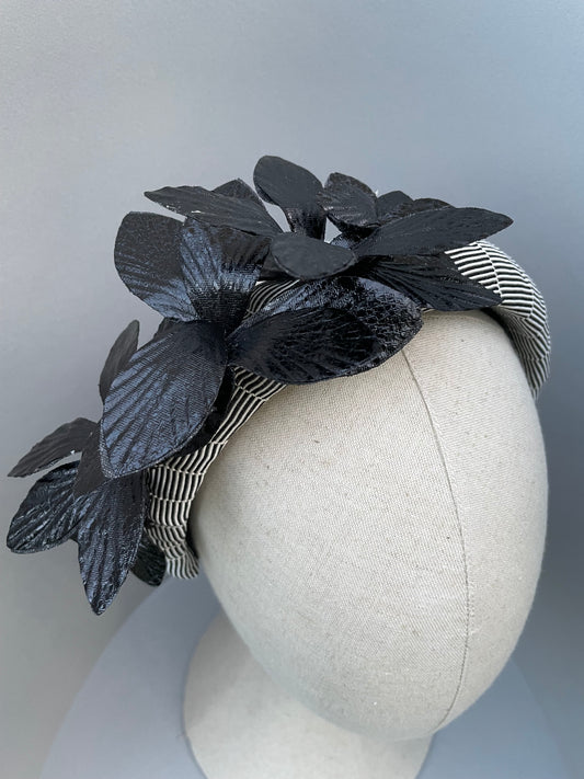 Black and white stripe padded headband with black leatherette orchid