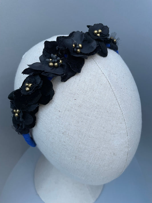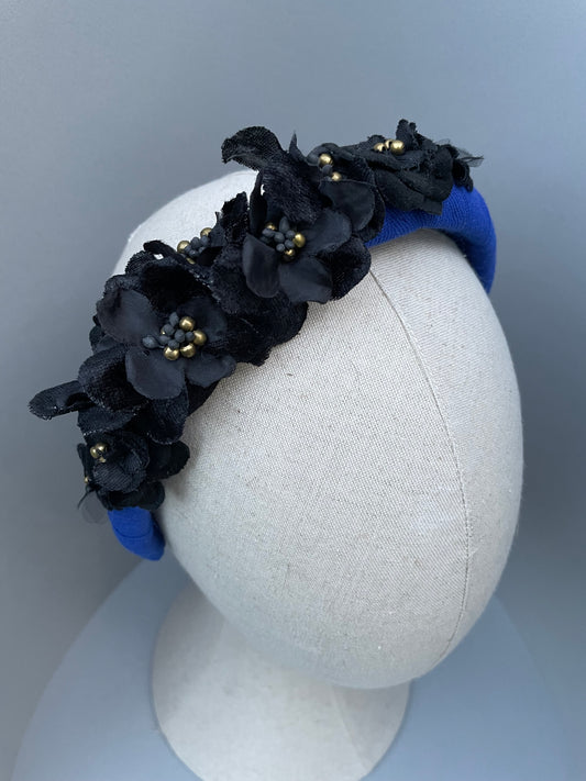 Cobalt blue slim headband with black velvet and silk flowers