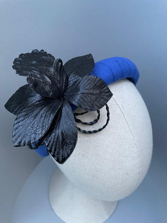 Cobalt blue padded headband with black leatherette orchid