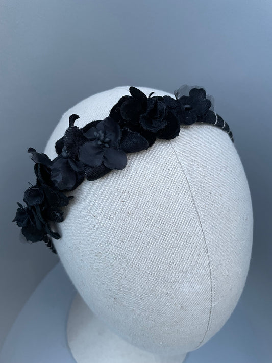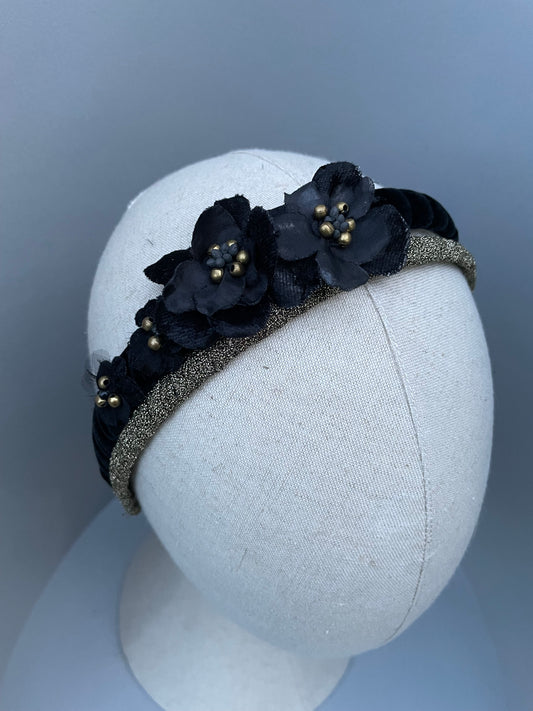 Black velvet padded headband with black velvet and silk flowers